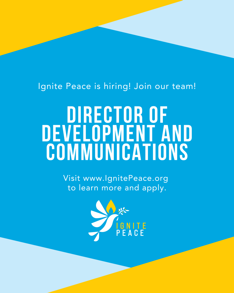Ignite Peace is seeking a mission-driven Director of Development and Communications to lead fundraising and strategic communications efforts. This is a hands-on leadership role for a dynamic team player with a passion for social justice, a talent for donor engagement, and the ability to tell powerful stories of impact.